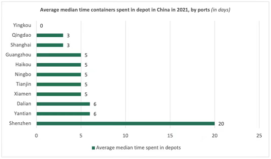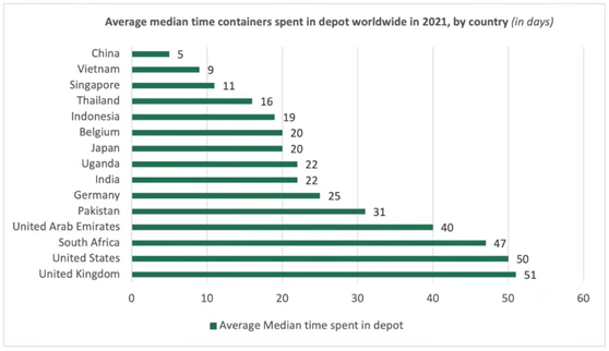 Container xChange和Fraunhofer CML的一項研究發(fā)現(xiàn),2021年,集裝箱在中國倉庫停留的平均時間為5天,而2020年為16天。其他主要出口國,包括越南 新加坡 泰國和印度尼西亞,集裝箱在倉庫停留平均時間分別為9天 11天 16天和19天。2021年,集裝箱在倉庫停留時間最長的是美國和英國,其平均停留時間分別為50和51天。相比之下,集裝箱在德國的停留時間為25天。