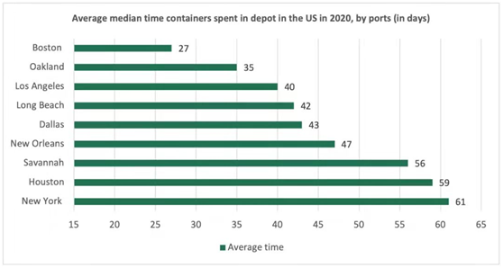 2021年美國港口集裝箱平均中轉(zhuǎn)時間