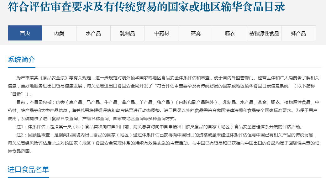2. 向中國出口食品的國家或地區(qū)經(jīng)過我國食品安全管理體系和食品安全狀況評估、審查。部分產(chǎn)品需在符合評估審查要求及有傳統(tǒng)貿(mào)易的國家或地區(qū)輸華食品目錄內(nèi)(查詢網(wǎng)址http://43.248.49.223/index.aspx)。