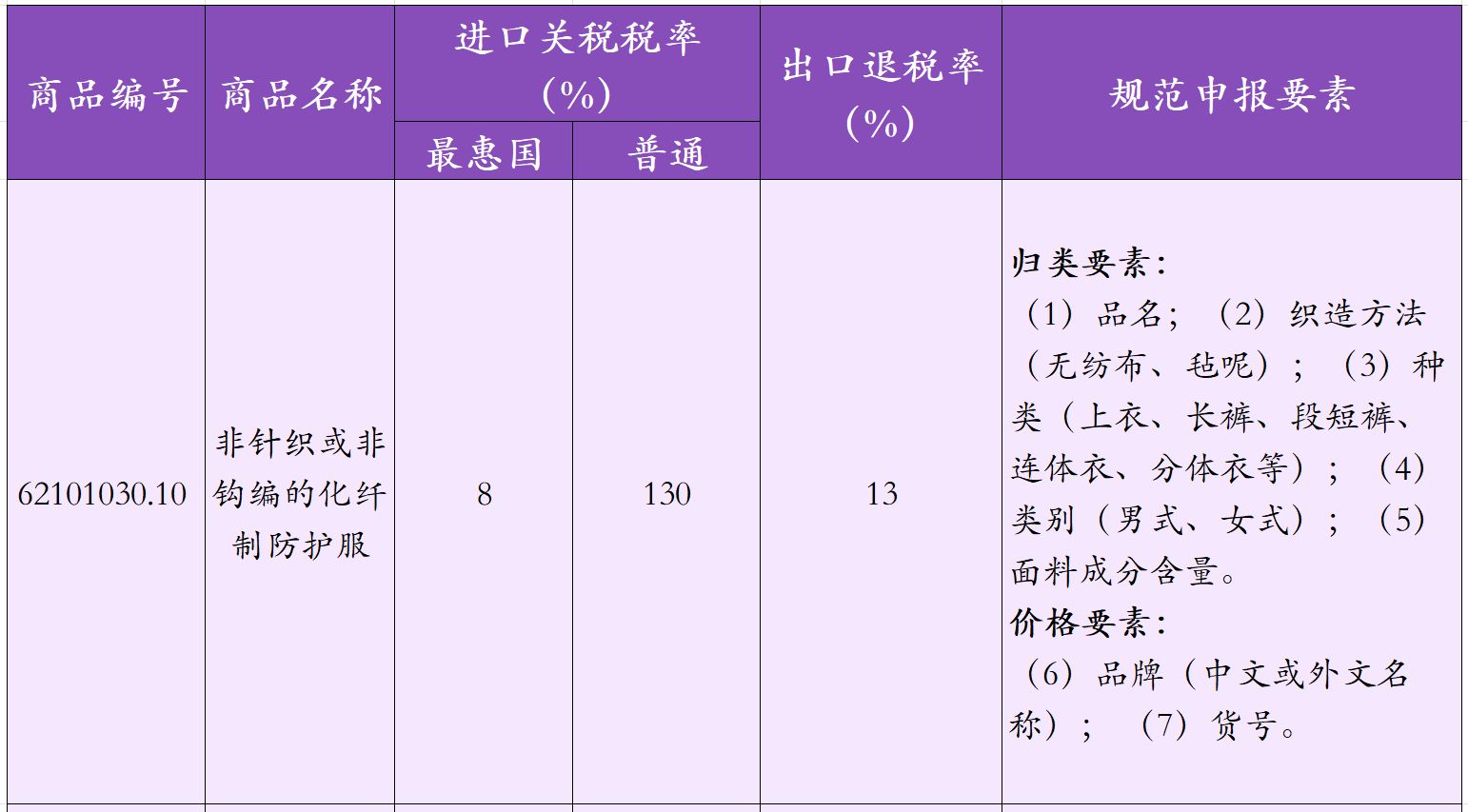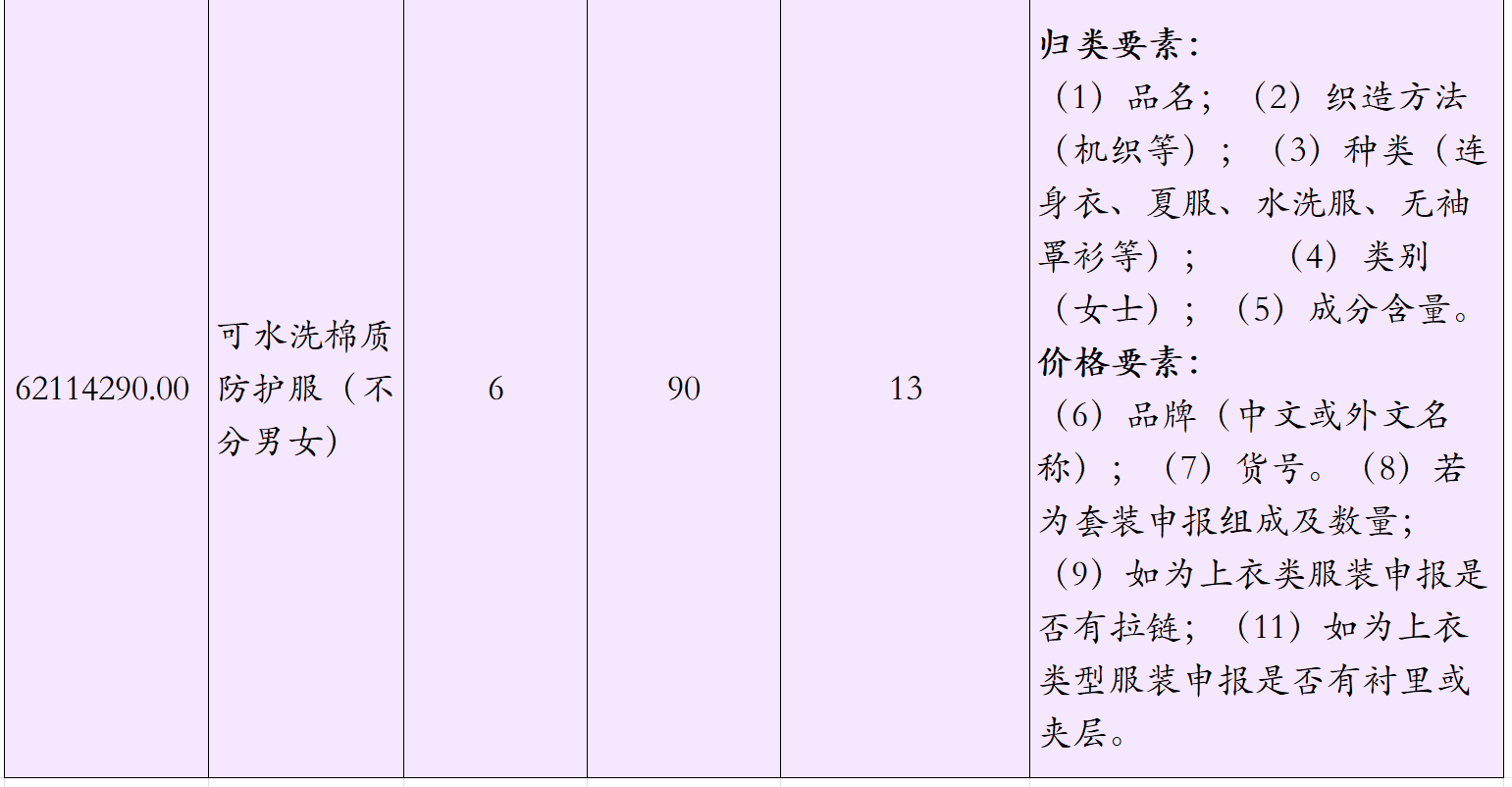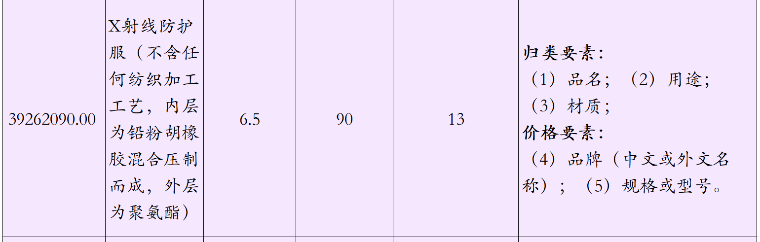 還有一些特殊的防護(hù)服,如醫(yī)院里放射性檢查工作人員穿著的X射線防護(hù)服,該防護(hù)服不含任何紡織加工工藝,分為內(nèi)層和包裹層兩部分組成,內(nèi)層為鉛粉和橡膠混合壓制成片,制成身體所需防護(hù)部位的樣式,內(nèi)層被聚氨酷片包裹,聚氨酷片構(gòu)成該商品塑料的基本特征這類防護(hù)服可以保護(hù)人體的骨髓及造血系統(tǒng)、生殖器官、甲狀腺和內(nèi)臟等重要器官,減少X射線對人體的損害。常見的防護(hù)服可能涉及的歸類及規(guī)范申報(bào)要素如下:
