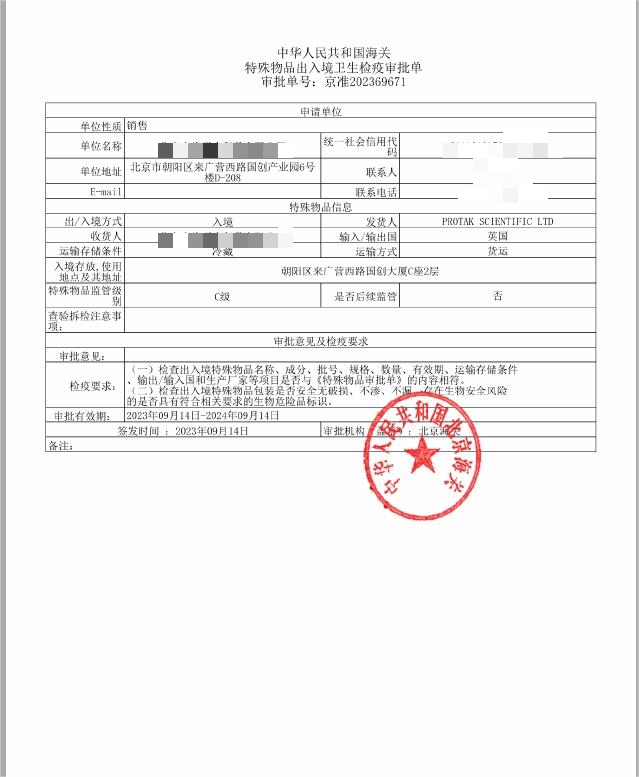 1.客戶提供情況說明,產(chǎn)品分析證書,風(fēng)險評估報告。在生物試劑進口清關(guān)之前辦理特殊生物試劑許可證,一般在5個工作日內(nèi)能完成《出/入境特殊物品衛(wèi)生檢疫核銷單》的申請。